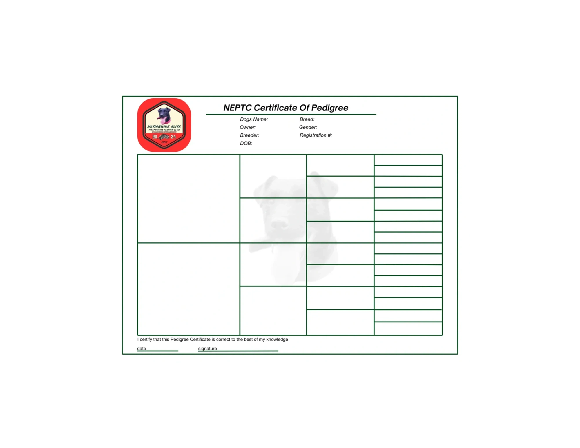 Both Parents have to be registered with the NEPTC in order to get a copy of your puppies/litters Pedigree